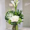 Cylinder clear 6x10 vase accented with stones decorated with hydrangeas, calla lilies, orchids, wrapped roses, and greens. Stylish and Fresh option.