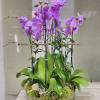 Orchid Fiesta: 5 Beautiful Orchid arrangement Artistically arranged in a square/cylinder crystal vase decorated with moss, curly willow, and greens. Phalaenopsis orchid party!