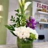 Sunshine Flower Arrangement Bouquet: Cluster roses, hydrangeas, orchids, and callas artistically placed in a square vase and a personalized card message.