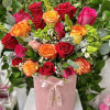 The Duchess Flower Box: Go Royal! Assorted Roses and Baby Roses in blush colors accented with greens, hydrangeas, stars of Bethlehem decorated in our deluxe boxes. 1 face arrangement