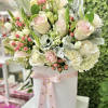 The Duchess Flower Box: Go Royal! Assorted Roses and Baby Roses in blush colors accented with greens, hydrangeas, stars of Bethlehem decorated in our deluxe boxes. 1 face arrangement
