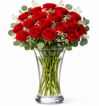 A classic clear glass cube with fresh red roses, greens and fillers.