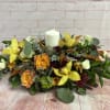 Vibrant and rich fall tones with just a touch of creme . Pillar candle to add the glow of warmth to your Thanksgiving table . Roses , orchids , hydrangeas and a textural mix of fall foliage .