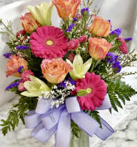 This Love in Bloom bouquet is the perfect arrangement for any occasion. Premium roses with tall stock and lilies, adorned by other bright fillers. This is perfectly arranged by our floral team just for you!