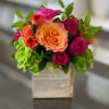 The Cheers Arrangement is a part of our Petite collection. A cheerful color combination of Pink Spray Roses, Orange Roses, Orange Ranunculus, Green Hydrangeas in a 4x4 wood planter box.Send someone who needs a little cheer pick me up.