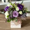 The Hope Arrangement is apart of our Petite collection. This bold purple arrangement is filled with lavender roses, Purple Lisianthks, white spray roses in a white wash 4x4 wood planter box. Give a gift of hope to remind someone that your behind them!