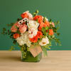 Bring sunshine indoors with our Jolie, a vibrant floral arrangement bursting with premium roses in coral, peach, and blush tones. Accented with white hydrangeas, lisianthus, and seasonal greenery, this modern-meets-classic design is hand-crafted in a sleek glass vase—perfect for celebrations, anniversaries, or just because.