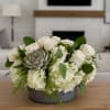 The Roses & Succulents Arrangement by My Blooming Business is a beautifully balanced blend of soft romance and natural texture. Designed in a chic tin cylinder container, this arrangement overflows with cream-colored roses, white hydrangeas, white lisianthus, and fresh succulents, creating a look that’s both timeless and stylish.