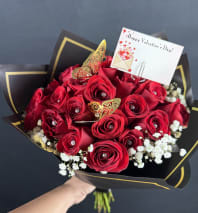 Celebrate timeless romance with our “Deep Love” Rose Box, a luxurious arrangement crafted by hand, by heart. Nestled in a soft blush pink box, these elegant ivory roses bloom with understated beauty, accented by delicate golden butterflies.
