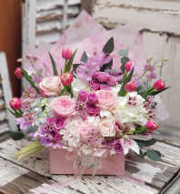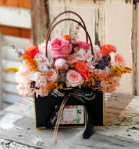 As a reminder, our arrangements are handcrafted with fresh flowers, and the photo is representing an overall theme or look of our design. Flowers always changing through seasonal and market conditions, so your arrangement just made for your order, and may vary slightly from the exact picture and we are sure you will be delighted with your purchase.
