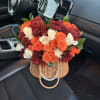 Bring the warm charm of fall to any occasion with this stunning basket arrangement. Designed in a woven handbag-style basket with elegant pearl detailing, it features a rich blend of orange and cream roses paired with deep burgundy chrysanthemums. Perfect for birthdays, fall celebrations, thank-you gifts or to brighten someone’s day with cozy autumn vibes.