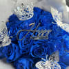 Celebrate in style with this striking arrangement of vibrant royal blue roses, wrapped in shimmering silver Korean paper for a luxurious touch. Accented with delicate silver butterflies and a sparkling birthday topper, this bouquet is the perfect gift to make their special day unforgettable. Ideal for birthdays and grand celebrations.