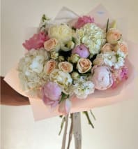 "From start to finish this arrangement is the loviest blend of light colors as well as florals that add such fresh sweet floral scents with so much life and elegance! We use ranunculuses, stalk, premium fresh cut roses, as well as some assorted greens. Such a great example of perfection.