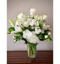 A classic mix of elegant white blooms, which may vary, according to seasonal and daily availability.