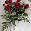 Beautiful one dozen Red Roses surrounded by lush greenery and baby's breath in a special silver glass vase