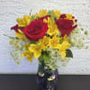 This radiant bouquet features cheerful yellow alstroemeria blooms beautifully complemented by deep red roses, all arranged in a clear glass vase with a decorative bow. A perfect gift to express joy, admiration, or heartfelt love for any special occasion.
