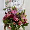 An elegant and vibrant floral arrangement filled with rich textures and stunning color. Designed in a clear glass vase, it features soft pink roses, lilies, gerberas, carnations, and delicate wildflower accents that bring freshness and movement. Shades of pink, fuchsia, and green blend beautifully to create a harmonious composition—perfect for birthdays, anniversaries, thank-you gifts, or brightening any space.