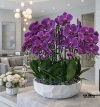 This elegant Six Purple Phalaenopsis Cascade orchid arrangement creates a striking vertical presence, making it ideal for grand interiors and modern living spaces with a vase 12.5" D X 5" T.