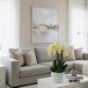 A high quality Four Yellow orchid arrangement with a vase 10" D X 7" T. An orchid arrangement flower deliver for any occasion design with fresh natural real beautiful Phalaenopsis cascade orchid plant minimalist decor.