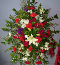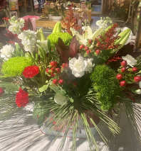 Combination of carnations, Christmas greens, pinecones and ribbon.