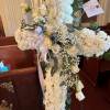 Drawing loved ones close in a tender embrace, this graceful cross unites hearts with the purity of white roses and the verdant embrace of lush greens, all set upon a backdrop of delicate white mums. Each bloom whispers of cherished moments shared, while the surrounding greenery envelops with comfort and solace. In this sacred space, may the memory of those we hold dear be forever cherished, their spirit enduring in the gentle whispers of nature's embrace.