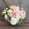 Featuring lush Pink O’Hara garden roses, Pink Mondial roses, and Crème de la Crème roses, paired with delicate soft pink lisianthus and ranunculus for movement and texture. White hydrangea and spray roses add fullness, while alstroemeria and clusters of green coffee berry bring a natural, garden-inspired finish.