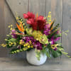 This tropic delight is packed with amazing Ginger, Birds of paradise, Anthurium, Dendrobium Orchids, Oncidium Orchids, and Protea all within a beautiful white ceramic container