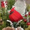 This elegant Christmas centerpiece has all the beautiful elements for a warm and inviting Holiday Display. Included in our design are Rose, Coffee Berry, Dusty Miller, and Mixed Winter greenery, Snowy pinecones, red glass ornaments, and an adorable miniature Cardinal faux bird