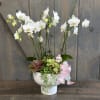 This beautiful planter is designed in a contemporary white ceramic pedestal vessel and filled with miniature White Phalaenopsis Orchids and a variety of succulents.