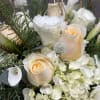 This elegant arrangement is a perfect accent to a candle lit Holiday evening! Included in this design is a gold cylinder vase with Roses, Hydrangea, Mini Calla Lilys, Lisianthius, Clover, Winter greens, and Gold Birch branches.