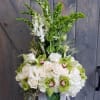 This stunning design is Immaculate and elegant. The flowers included in this arrangement are Snap Dragons, Bells Of Ireland, Roses, Cymbidium Orchids, Hydrangea, Mini Green Hydrangea, Lilies, Veronica, and Seeded Eucalyptus