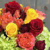 If you are looking for bright and festive, then this arrangement is for you! Included in this design are Red Roses, Yellow Roses, Orange Roses, Red Spray Roses, Orange Spray Roses, Yellow Spray Roses, and Mini Green Hydrangea