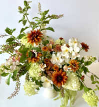 With this in mind, we offer mostly seasonal "designer's choice" designs, allowing our customers to choose a desired color palette and feel. Our customers choose to order with us over and over knowing we'll always provide something fresh, unique, sustainable, and stunning within the color palette they select. This supports our philosophy of art over assembly line, which allows us to buy only what's fresh and in-season. This also allows us as designers to stay flexible and creative in our work. We love working with our customers and your trust and belief in us means everything.