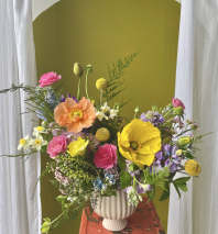 The "Fairy Meadow" arrangement is designed to capture the feeling of walking into a wildflower meadow on a sunny afternoon, gathering blooms along the way. Big, small, wild, but most of all playful. This arrangement is colorful, cheery, uplifting, and full of variety. It is designed for that person in your life who is often knee deep in their garden, getting lost in its magic. Regardless, anyone will admire this arrangement for its variety of blooms, and its overall whimsy.
