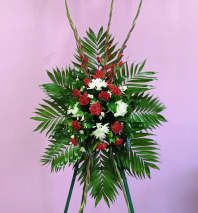 This charming arrangement features, red roses, hot pink carnation, red carnation, and others.