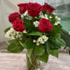 6 red roses with greenery