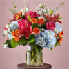 Sweep someone off their feet with our colorful Casablanca Bouquet. The blue hydrangea blooms paired with the orange spray roses create a uniquely perfect palette for that energetic love in your life.