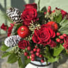 A festive burst of holiday richness, "Hi, Snowman" blends lush red roses, winter berries, frosted pinecones, and glossy mini apples(faux) for a look that feels both classic and vibrant. Nestled in a charming snowman ceramic pot, this arrangemtn brings together the warmth of the season. Perfect for gifting or brightening your holiday table with a touch of winter magic.