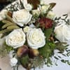 Bring a touch of timeless sophistication to any space with Rustic Elegance. This lush arrangement pairs creamy white roses with textured seasonal greens, accented by warm earth tones for a natural harvest-inspired charm. Designed in a sophisticated glass fall colored vase, it's the perfect statement for fall gatherings, holiday tables, or as a refined gift that celebrates the beauty of the season.