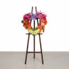 Offer a beautiful and memorable tribute with this stunning, heart-shaped floral wreath. This arrangement is a radiant expression of love and remembrance, designed to honor a cherished life. The wreath features a breathtaking spectrum of colors, transitioning from deep pink and rich lavender roses at the top to brilliant shades of hot pink and magenta. The colors then flow down into fiery oranges, yellows, and warm tones, including gerbera daisies and other complementary blooms, culminating in a base of soft pale yellow dahlias.