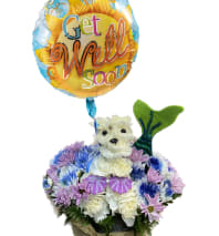 EXCLUSIVE Our doggie doctor provides a sure cure for anyone feeling under the weather. And best of all, he's always willing to make house calls! Part of our signature a-DOG-able® collection, this healing hound has been handcrafted from crisp white carnations, vibrant yellow daisy poms and more. Ready to brighten anyone’s day, he’s the perfect prescription for smiles.