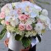 Elevate any occasion with our Ethereal Grace Box, a breathtaking display of timeless beauty and sophistication. This luxurious arrangement features cascading white phalaenopsis orchids, soft blush roses, creamy ivory hydrangeas, and delicate dahlias, artfully composed in our signature hat box for a refined, modern presentation.