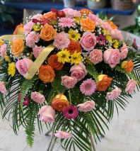 This radiant display is filled with beauty, brightness, and love—an ideal choice for expressing sympathy or celebrating the vibrant life of someone dearly missed. Featuring pink roses, golden mums, purple iris, and soft delphinium, it brings a sense of peace and color to any setting. A comforting gift for a memorial service or to send your thoughts to the home.