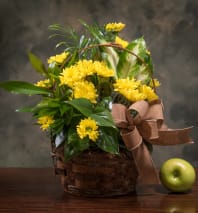 Modern ceramic planter filled with easy to care for houseplants. Accented with curly willow branches and a bird or butterfly. Decorated with fresh cut flowers for delivery. 10" diameter container.