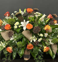 Green and whit cross standing spray. Created using large tea leaves, variegated aspidistra, white roses, snap dragons and more.