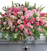 As hopeful as the bright horizon ahead, this glorious white bouquet of hydrangea, roses, lilies and snapdragons is a peaceful tribute to a truly beloved.