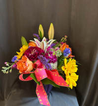 A unique and stylish design for the person that enjoys something different. This particular arrangement features Birds of Paradise, Hanging Amaranths, Sunflowers, Tulips, Stock and Roses. This arrangement may have a few changes when delivered due to seasonal flowers however, it will for sure be filled with UNIQUE CLASSIC FLOWERS and will be sure to IMPRESS THE RECIEPENT.