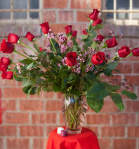 A dozen long stemmed, Colombian or Ecuadorian red roses displayed with your selection of cellophane and bow. Please indicate in special instructions.