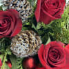 Santa baby really loves me 12 red roses arranged in a beautiful red cube adorned with mix winter greens pinecones and a red velvet bow