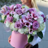 Amazing pink flower arrangement featuring white or pink lilies, white hydrangeas, pink roses and greenery assembled in a velvet box. Perfect flower gift for occasions like anniversaries, baby showers, birthdays or just to surprise someone who loves lilies.